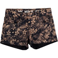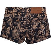 Short dark blue denim shorts in a skinny fit with a flower print. The shorts have an adjustable elastic waist with a button, belt loops, a leather patch, front and back pockets and roll up legs. Note that sizes up to and including 128 have a snap, and size 134 and higher have a jeans button.