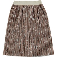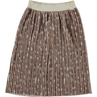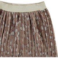 The Bailini pleated skirt is a Molo favourite that's great for parties but also for everyday wear with a casual top. It is bronze with white spots and glitter. It has a beige elastic waist.