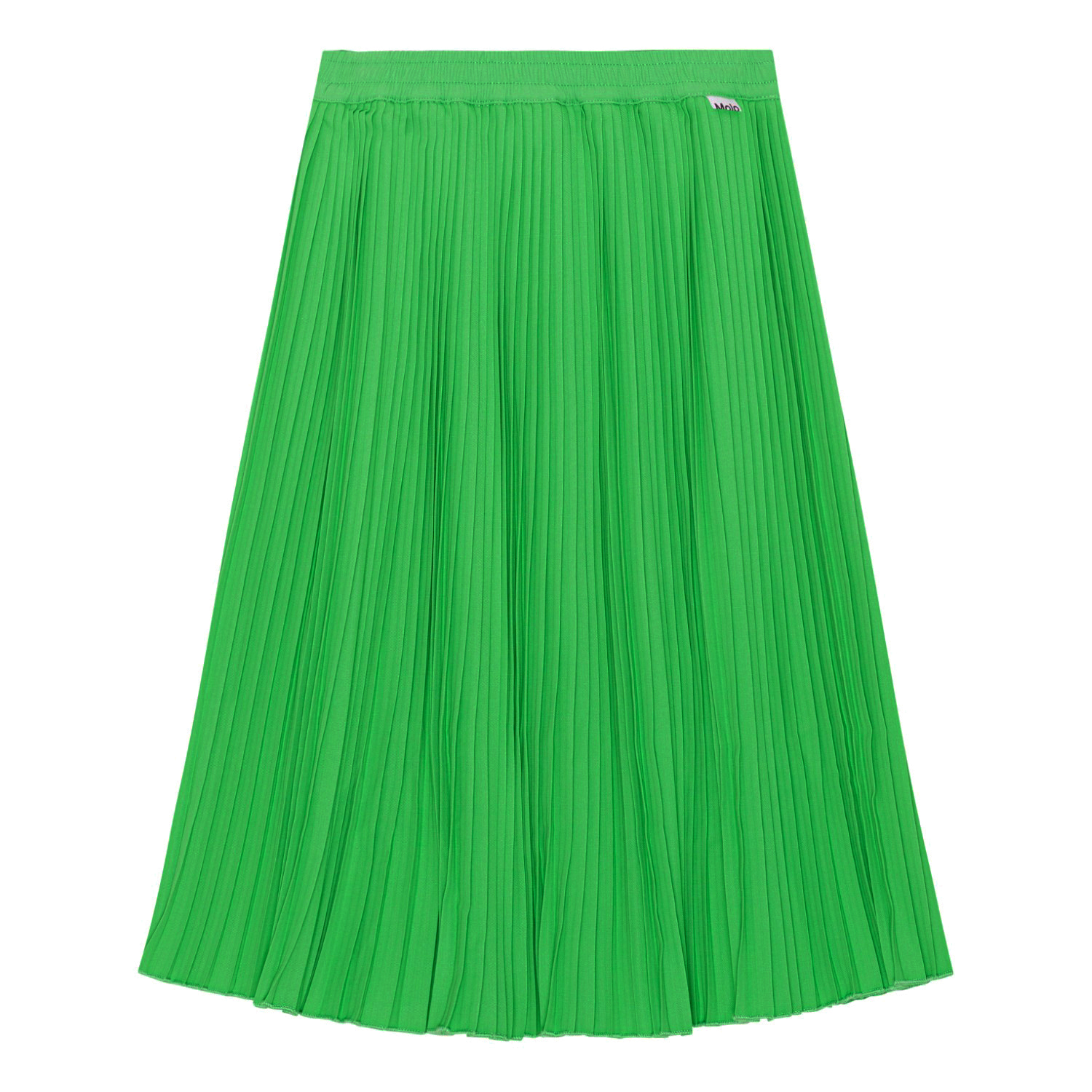 Green, knee length, pleated skirt. The skirt is in 100% polyester and has elastic at the waist for easy dressing.