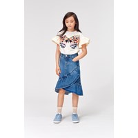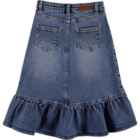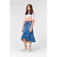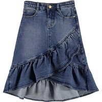 Belinda is a blue denim skirt with a wrap around effct and a ruffle edge. The skirt has pockets on the front and back.