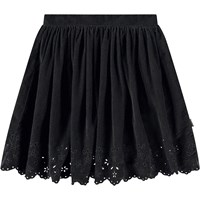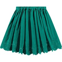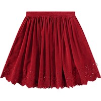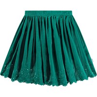 Green mini corduroy skirt in organic cotton with an elegant lace pattern of small flowers at the bottom of the skirt. The skirt is knee-length, easy to slip into, and comfortable to wear with its elastic waist.