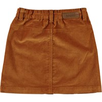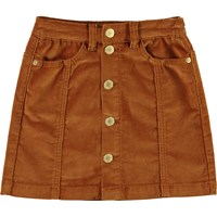 Bera is a corduroy skirt in brown with a button front closure. It has belt loops and pockets on the front.