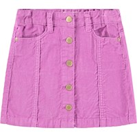 Dark blue corduroy skirt with buttons for fastening. The skirt reaches mid-thigh and has a waist with belt loops and front pockets. The beautiful cut includes detailed stitching that runs from the pockets down.