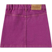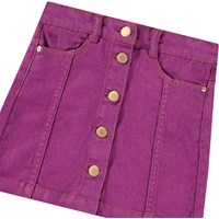 Purple denim skirt with gold-coloured buttons for fastening. The skirt reaches mid-thigh and has a waist with belt loops and front pockets. The stylish cut features detailed stitching that runs from the pockets down.