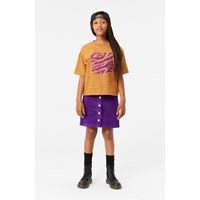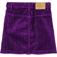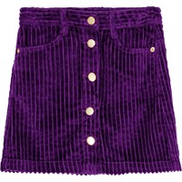 Purple corduroy skirt with gold-coloured buttons for fastening. The skirt reaches mid-thigh and has a waist with belt loops and front pockets. The beautiful cut includes detailed stitching that runs from the pockets downwards.