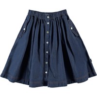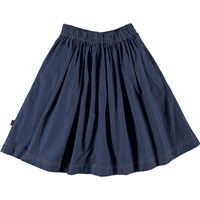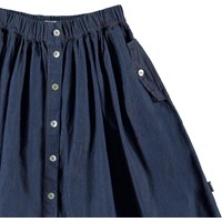 Bolette is a blue denim skirt with mother of pearl buttons down the front and on the front pockets. It has an elastic waist for a comfortable fit. Bolette is made in 100% organic cotton.