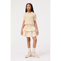 Beige knee-length skirt in organic cotton chambray. The skirt has a wide waistband sewn with smocking, with a voluminous skirt in 2 layers and delicate wavy bands at the bottom. The elastic waistband makes it easy to put on and comfortable to wear.