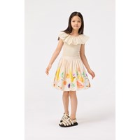 Light beige knee-length skirt in organic cotton. The skirt has a fixed waist at the front, while at the back it is elastic, making it easy to put on and comfortable to wear. The skirt gathers around the waist, giving it a nice volume. It has a print of hand-painted fruits.
