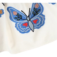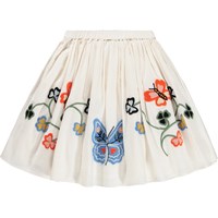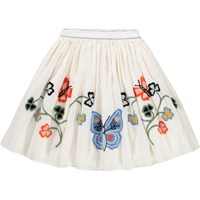 Knee-length white skirt made of organic cotton with a decorative embroidery of flowers and butterflies. The skirt has a fixed waistband at the front and elastic at the back, making it easy to put on and comfortable to move in. The skirt is gathered all the way around the waist, creating a beautiful and airy volume.