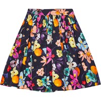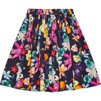 Black knee-length cotton skirt with a fixed waist at the front and an elastic waistband at the back, making it easy to put on and comfortable to wear. The skirt gathers around the waist, giving it a nice volume. Additionally, the skirt features a print of colourful flowers that stand out beautifully against the black background.