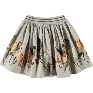 Brenda is a taupe, circular skirt in an organic cotton poplin. Brenda has an elastic waist with 2 brown stripes and is in the Fluttering Horses print, which shows a group of horses with butterfly wings, flying around and having fun.