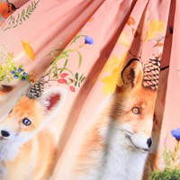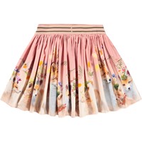 Pink circular-cut skirt made of organic cotton. The skirt is comfortable and easy to put on with the elastic striped waist. The skirt has a print of baby animals and flowers.