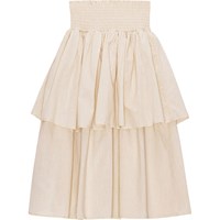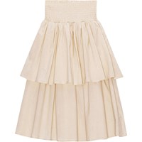 Sand coloured, long skirt with a wide, smocked yoke that makes it comfortable and easy to slip on and off. It has two skirts that give it extra fullness. You can wear the skirt with the matching top in the same colour for a complete set.