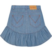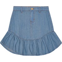 Blue denim skirt with a pretty ruffled hem. The skirt is knee-length and has both front and back pockets. It has a zip and button fastening, as well as belt loops. The waistband features an adjustable elastic for a customized fit.