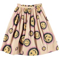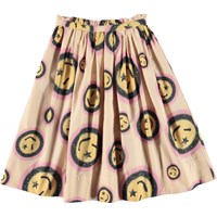 Brisa is a long cotton skirt with a print of yellow smiley faces that have stars in one eye. The skirt has a zip closure at the side.
