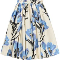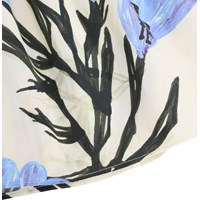 Off-white knee-length skirt made of soft organic cotton poplin with a beautiful print of blue flowers. The skirt has a fixed waistband with a fine, small ruffle edge at the front, while elastic at the back makes it easy to put on and take off. The skirt has a circular cut and gathered all around the waist, which gives a light and lively drape.