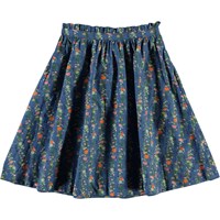 Brisani is a blue skirt with a print of vertical flower chains. It is in cotton and has a side zip closure.