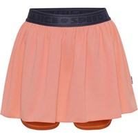 Ola is a coral red skort with a dark blue elastic waist that has a printed text. It has orange shorts under the skirt, which makes it extremely versatile. Ola is part of Molo's new sports collection, which helps integrate sports and fashion. The skort is comfortable and made in technical materials. Molo’s sports collection is created with a unique, high performance technology called HeiQ Smart Temp, which supports the body's own ability to cool down. The cool down function is activated when the body gets warm and sweaty, and then turns off when the body has cooled down. HeiQ Smart Temp ensures optimal comfort and performance. It has been independently tested to ensure that it is safe for the skin.
