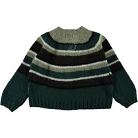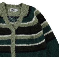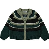 Gail is a green striped knit cardigan. It has a v-neck, a short fit and button closure.