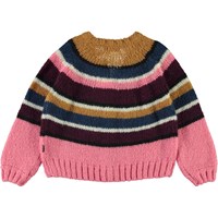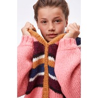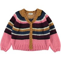 Gail is a striped knit cardigan that is pink on the bottom and mustard yellow on top. The cardigan has a v-neck