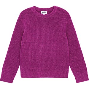 Pink knitted sweater in a soft wool blend. The sweater has a round neckline and ribbed cuffs at the sleeves, neckline, and waist. It is comfortably warm and features a regular fit, leaving enough space to layer a long-sleeved T-shirt underneath.