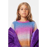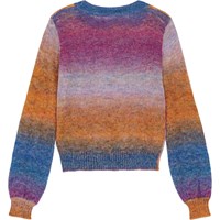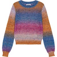 Multicoloured jumper in a soft wool blend. It is thin and lightweight with a loose fit and a large round neckline. There are ribbed edges on the sleeves, neckline, and bottom of the jumper. The jumper is knitted in uniquely coloured yarn, which means that the colour pattern in the stripes will vary from style to style.