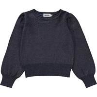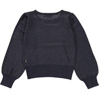 Dark blue knit jumper with glitter in cotton with metallic glitter. It has a hole pattern on the top of the front and back as well as long, full sleeves with a wide rib edge. It has a wide rib edge at the bottom and is in a regular fit.