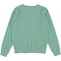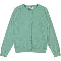 Georgina is a pistachio green cotton cardigan. It is in a delicate knit pattern and has a button closure.