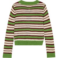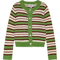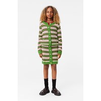 This knitted retro-striped cardigan is made from a soft wool blend. The cardigan has a snug fit, a round neckline, and green ribbed edges. It also has a button closure with lovely light mother-of-pearl buttons. You can pair it with a matching skirt to create a stylish and cosy knit set.