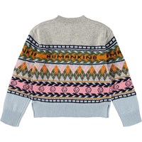 Beautiful multicoloured wool sweater inspired by Nordic knitting history. The sweater has beautiful colours in patterns and the text ''Humankind'' on the front and back, with small smiling faces all around. It has a loose fit with ribbed edges around the neck, sleeves and waist.