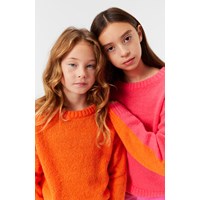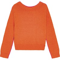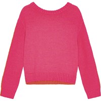 Pink and orange reversible sweater in soft alpaca wool. The sweater has a loose fit with a large round neckline and ribbed edges at the sleeves, neckline, and hem. It is reversible, so both the orange and pink side can be worn as the front.