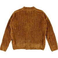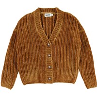 Gianna is Molo's new chenille knit cardigan in a warm mustard colour. The cardigan is short, has a v-neck and a button closure.
