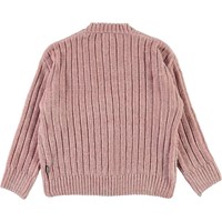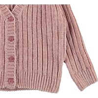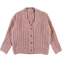 Gianna is Molo's new chenille knit cardigan in pink. It has a v-neck, a short fit and a button closure.