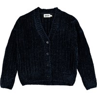 Gianna is Molo's new chenille knit cardigan in dark blue. The cardigan is short, has a v-neck and a button closure.