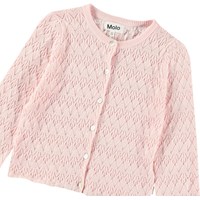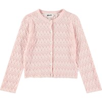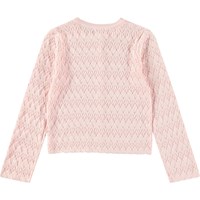 Pink knitted cardigan in soft organic cotton with a lovely lace pattern and wavy edges on the sleeves and bottom of the cardigan. The cardigan has a regular fit, mother-of-pearl buttons on the front, and ribbed edges at the neckline.