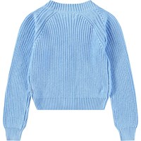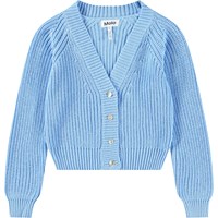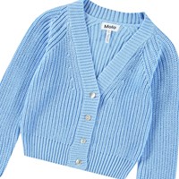 Soft light blue knitted cardigan in cotton with a V-neckline, ribbed edges at the collar, sleeves, and hem, and mother-of-pearl buttons on the front.