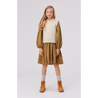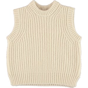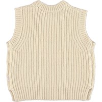 Gilberte is a light coloured knit waistcoat. It has a round neck and slits at the sides.