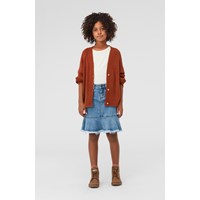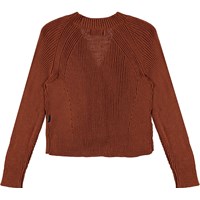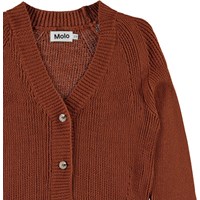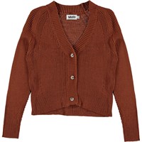 Gilda is a knit cardigan in brown. It has a v-neck, a short fit and button closure.