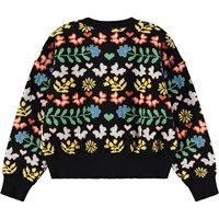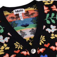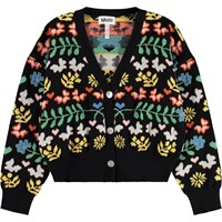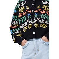 Black cardigan made of soft cotton knit with a colourful pattern of flowers and leaves. The cardigan has a loose fit, V-neck, buttons, and ribbed edges at the sleeves, bottom, and neck.