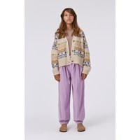 Off-white knit cardigan in a nordic-inspired pattern with small smiley faces, hearts and peace signs as well as "Peace Now" in differen colours. This cardigan is in a soft wool blend. It has a V-neck, a button front closure, long sleeves with rib and rib at the bottom. The cardigan is in a loose fit. It's the perfect extra layer for cold days.