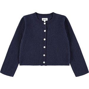 Soft dark blue cardigan made of brushed wool for a fluffy look. This cardigan has a nice edge at the sleeves and waist, as well as a ribbed edge around the neck and a practical button closure at the front.