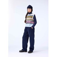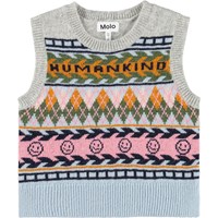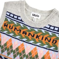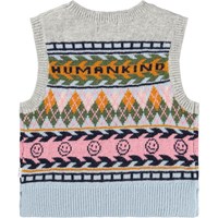 Multicolored knitted wool vest. The sweater is inspired with Nordic patterns, smiling faces and the text ''Humankind'' on the front and back. There is ribbed edges around the neckline, sleeves and waist.