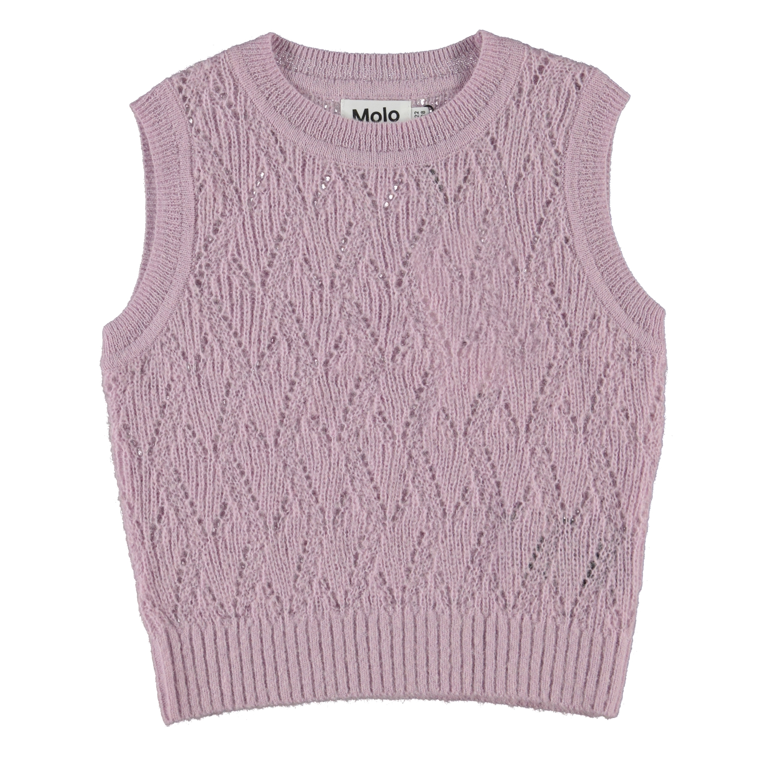 Light purple knit waistcoat- Perfect over dresses, shirts and blouses as an extra cool layer on any outfit. This waistcoat is in an alpaca/wool blend and is in a lovely hole pattern. It has a round neck with rib, a rib edge at the sleeves and bottom and is in a regular fit.