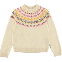 Gretchen is a light coloured knit top inspired by icelandic sweaters. It has a wonderful knit pattern of smiley faces on top in yellow and pink.