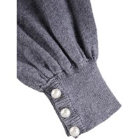 Nice grey cardigan made of a wool and cotton blend. This cardigan has nice details with large balloon sleeves and pearl buttons on the sleeves and all the way down the front. Wide ribbing on the sleeves and at the waist, as well as ribbed edge around the neck.