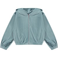 Light blue velour hoodie with a zip front closure. This hoodie is in a soft cotton/polyester blend. It has a hood, a zip front closure, long sleeves with elastic, elastic at the bottom and is in a loose fit. Wear the hoodie with the matching Adriana joggers in the same colour and fabric for a cool look.