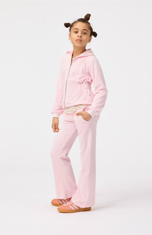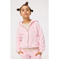 Pink velour cardigan with a hood, ribbed cuffs around the sleeves, and a wide elastic at the waist, giving the cardigan a snug fit.
