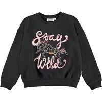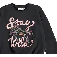 Maja is a black sweatshirt with embroidered horses on the front and the text 'Stay wild'. It has rib at the neck, sleeves and waist.