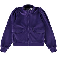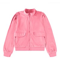 Pink cardigan made of soft velour. The cardigan has a zipper, pockets on the side with detailed pocket flaps, gathers at the shoulders and a wide ribbed edge at the sleeves and waist. Combine the cardigan with the matching pants for a complete and comfortable velour set.