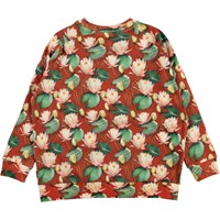 Mandy is a brown sweatshirt with a print of pink water lilies and green leaves. The sweatshirt has a wide fit.